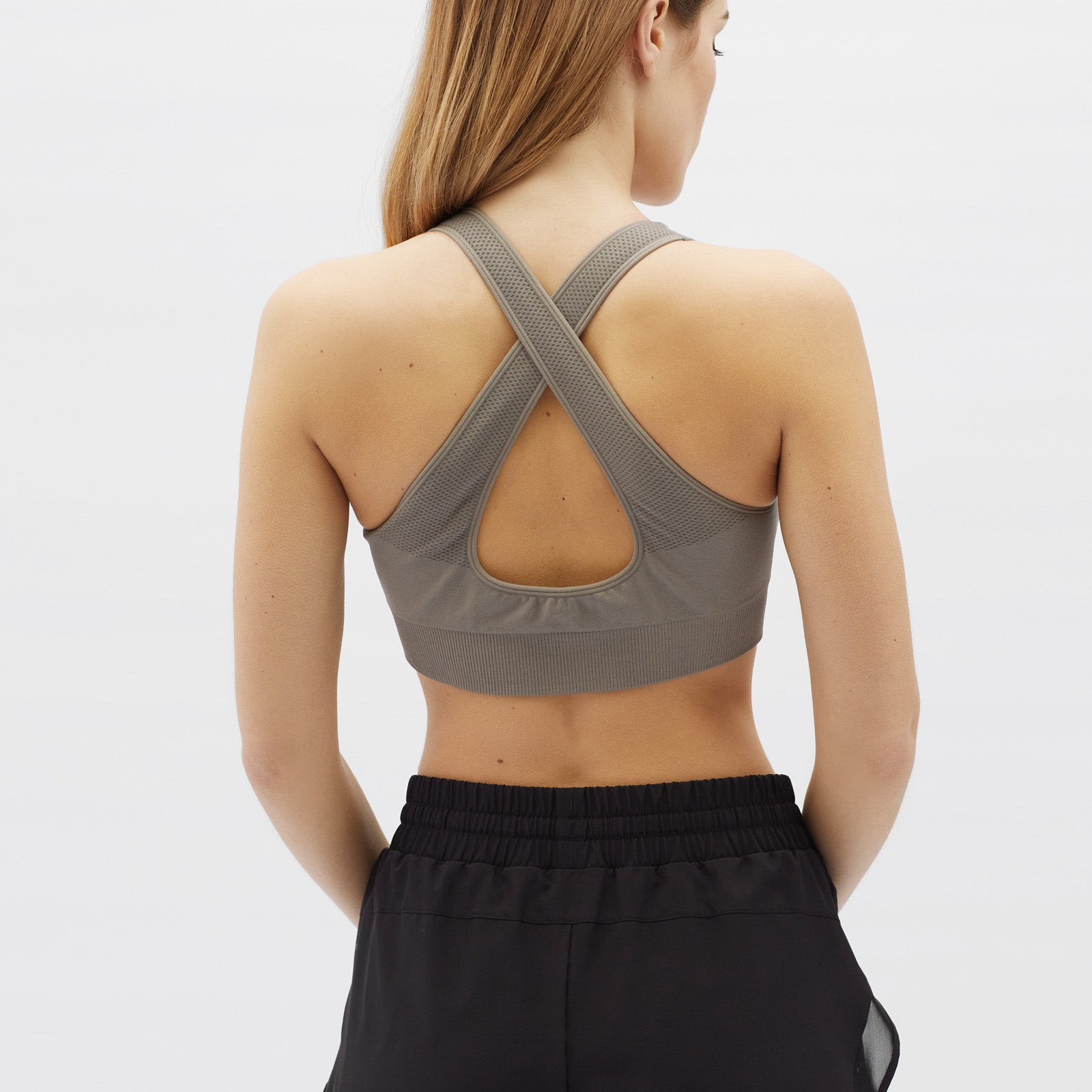 Bariana women’s sports bra, seamless, reversible, medium support, removable pads, front perforation, crossed back straps, elastic band, light/dark option, ideal for cycling, outdoor, or everyday wear.