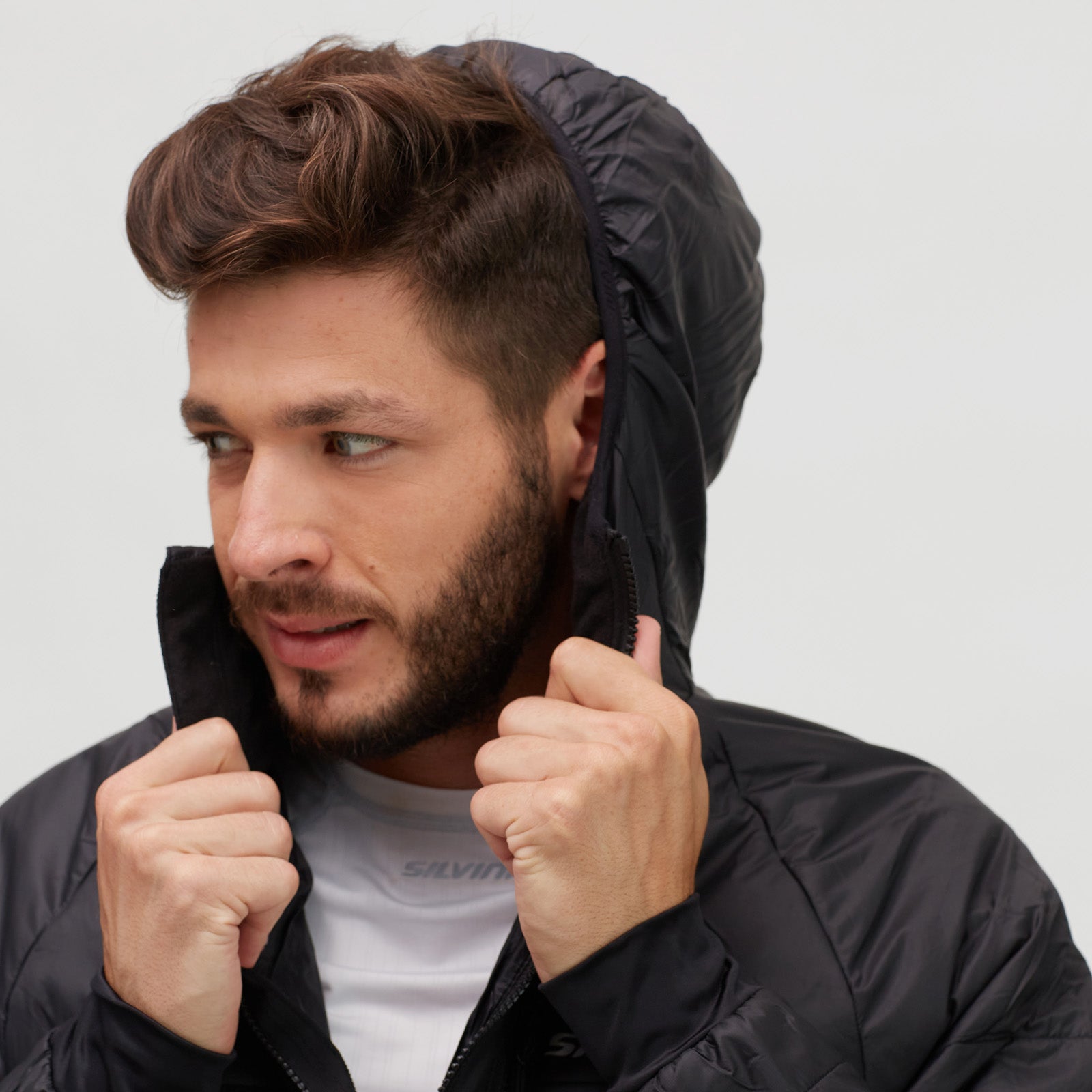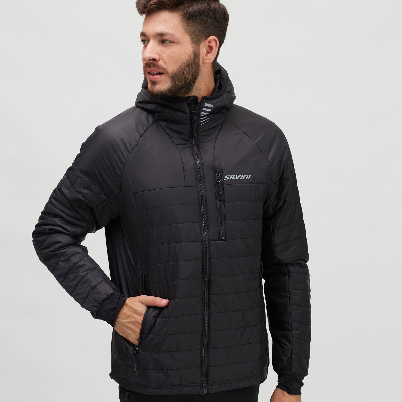 Rutor is a men’s windproof insulated hooded jacket, lightweight, breathable, and packable, ideal for outdoor activities, hiking, cross-country skiing, and casual wear.