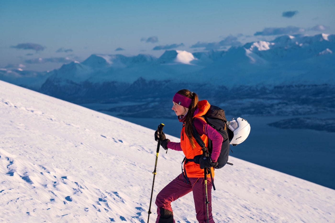 Women's insulated ski touring vest with detachable hood and pockets for climbing skins. It is made of windproof Windbreaker material and QuatroFLEX Shell with Primaloft® Gold Insulation Active 40 g insulation.