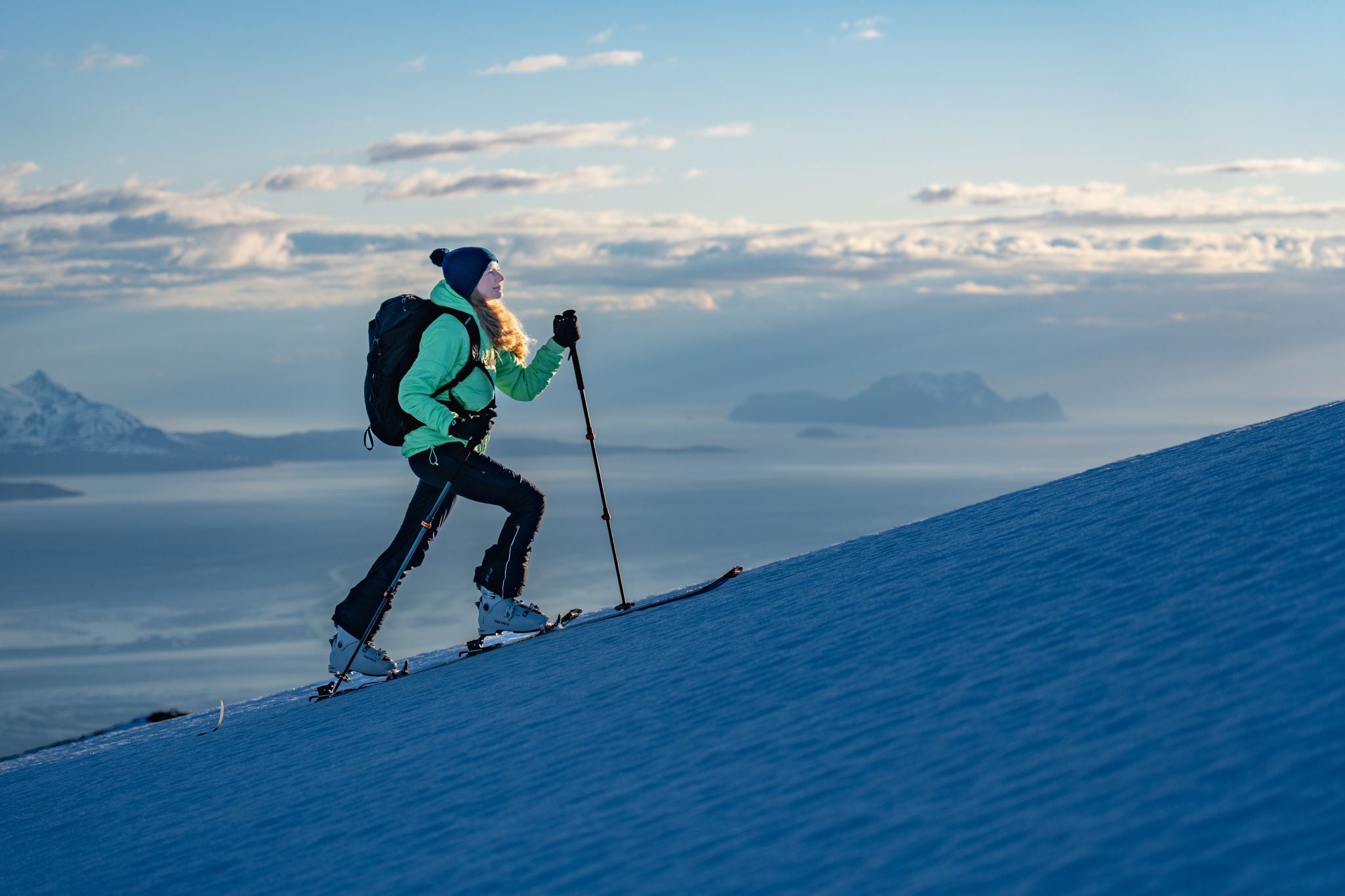 Women's windproof, breathable Soracte pants for ski touring, cross-country skiing, and outdoor activities. Anatomical fit, elastic knees, and reflective details ensure comfort and safety.